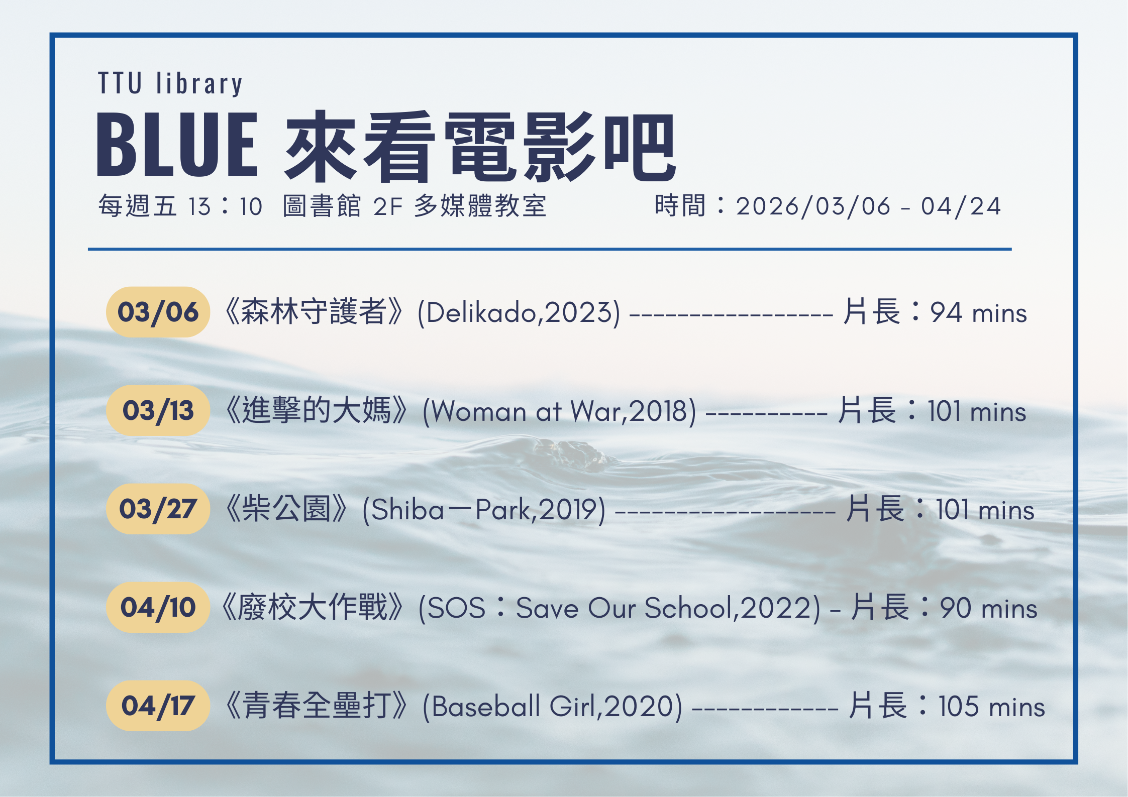 【公告】圖書館《BLUE 來看電影吧》活動,歡迎全校師生參加~