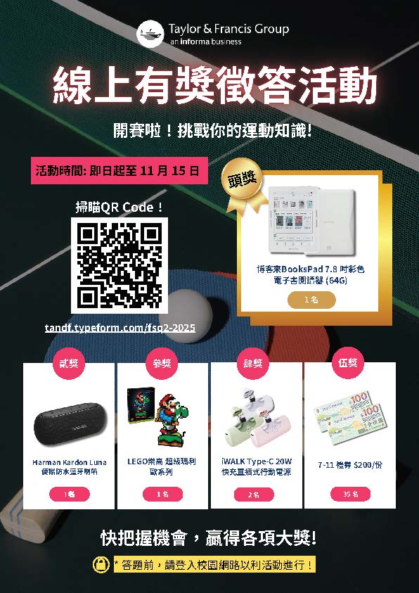 您是否對運動科學研究有興趣呢? 快來參加Taylor & Francis 的線上有獎徵答來測試您的知識!除了發掘有趣的事實,探索全新的觀點,還能從我們豐富的期刊資源中發現深刻見解。不要錯過贏得精彩獎品的機會!