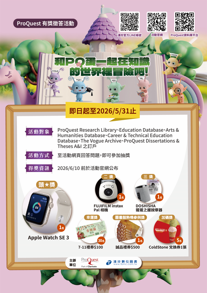 📍活動說明:針對ProQuest Research Library、 Education Database、Career & Technical Education Database、Arts & Humanities、The Vogue Archive和ProQuest Dissertations & Theses A&I進行線上有獎徵答活動,利用學校訂購的【ProQuest資料庫平台】尋找正確答案的文章並加入LINE好友。不限參加次數,參加次數越多,越有機會抽中Apple Watch SE3、FUJIFILM 掌上型相機、猩猩之握按摩器、7-11禮券多項好禮,加碼獎IG貼文留言活動,提升中獎機會!